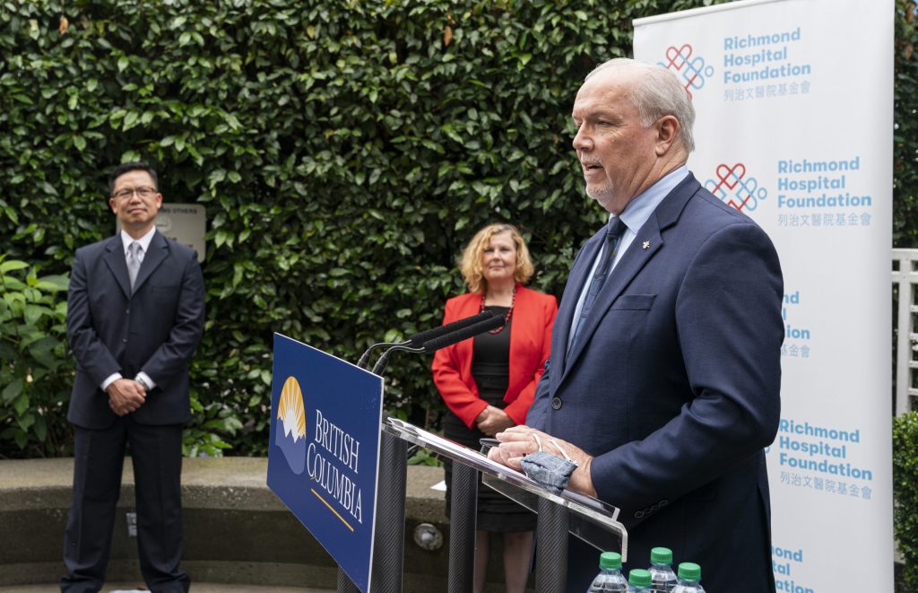 Premier John Horgan announces a bigger tower for Richmond Hospital while Dr. Richard Chan, Emergency Physician, Richmond Hospital and Natalie Meixner (President & CEO, Richmond Hospital Foundation) applaud the decision.