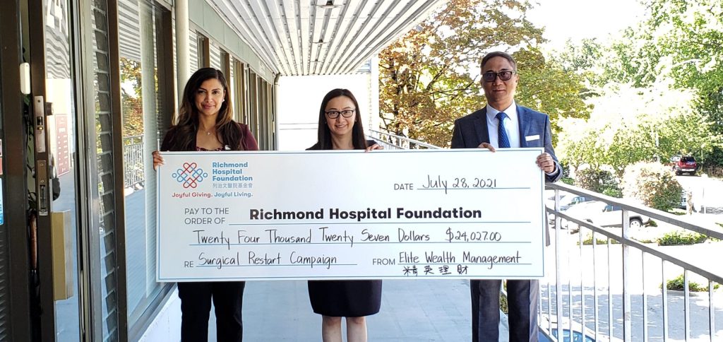 In June, Elite Wealth Management hosted a complimentary online information session, “Leave a Legacy through Planned Giving”, which focused on the impact of legacy giving for both individuals and the community. The webinar attracted over 100 attendees and introduced Richmond Hospital Foundation as a beneficiary organization. At the event, Elite Wealth Management also announced a matching gift of up to $10,000 for all individuals dedicating gifts to Richmond Hospital Foundation along with all consultation fees attributable to the seminar to be donated back to Richmond Hospital Foundation.