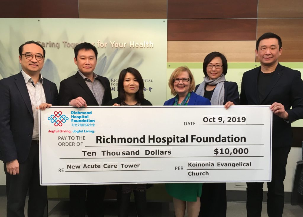 With a strong belief in giving back to the community, the Koinonia Evangelical Church has made a donation of $10,000 to Richmond Hospital Foundation’s ACT NOW Campaign in support of building a new Acute Care Tower for Richmond Hospital. With over 600 members, many of whom live and work in Richmond and have received health care from Richmond Hospital, the Koinonia Evangelical Church understands the importance of advancing high quality, lifesaving care in the community of Richmond.
