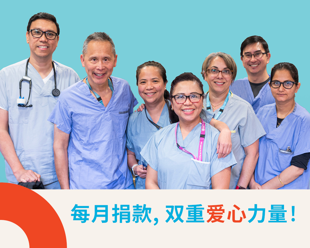 与医护携手 守护挚爱。现在,James 和 Grace Dy 将会 “一对一” 配对每一笔新的每月捐款,全年配对总额 20,000 元!